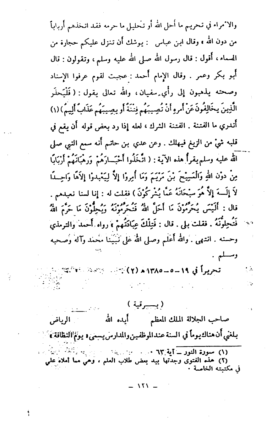 أتدري ما الفتنة، الفتنة الشرك، لعله إذا رد بعض قوله أن يقع في قلبه شيء من الزيغ فيهلك، وعن عدي بن حاتم أنه سمع النبي صلى الله عليه وسلم يقرأ هذه الآية {اتخذوا أحبارهم ورهبانهم أرباباً من دون الله والمسيح بن مريم وما أمروا إلا ليعبدوا إلاها واحداً لا إله إلا هو سبحانه عما يشركون} فقلت له: إنا لسنا نعبدهم قال: أليس يحرمون ما أحل الله فتحرمونه ويحلون ما حرم الله فتحلونه، فقلت: بلى، قال: فتلك عبادتهم " رواه أحمد والترمذي وحسنه انتهى. والله أعلم وصلى الله على نبينا محمد وآله وصحبه وسلم.