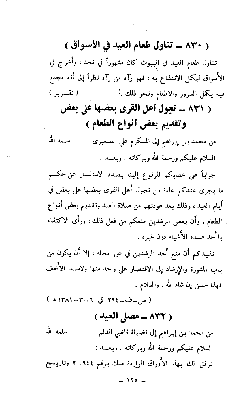 جواباً على خطابكم المرفوع إلينا بصدد الاستفسار عن حكم ما يجري عندكم عادة من تجول أهل القرى بعضها على بعض في أيام العيد، وذلك بعد عودتهم من صلاة العيد وتقديم بعض أنواع الطعام، وأن بعض المرشدين منعكم من فعل ذلك، ورأى الاكتفاء بأحد هذه الأشياء دون غيرها.