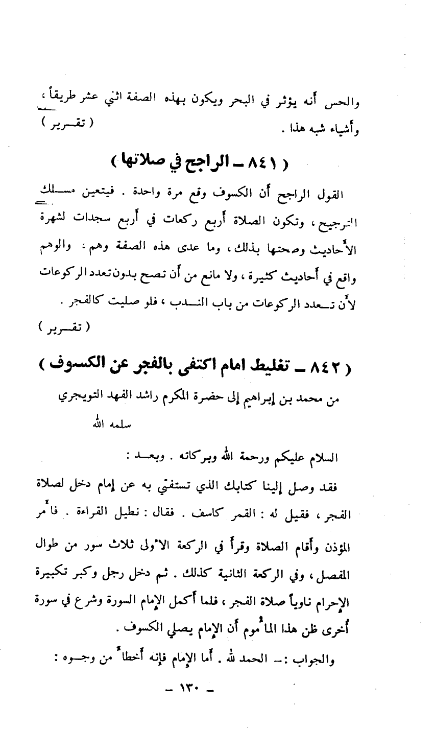 فقد وصل إلينا كتابك الذي تستفتي به عن إمام دخل لصلاة الفجر، فقيل له: القمر كاسف، فقال: نظيل القراءة، فأمر المؤذن وأقام الصلاة وقرأ في الركعة الأولى ثلاث سور من طوال المفصل، وفي الركعة الثانية كذلك، ثم دخل رجل وكبر تكبيرة الإحرام ناوياً صلاة الفجر، فلما أكمل الإمام السورة وشرع في سورة أخرى ظن هذا المأموم أن الإمام يصلي الكسوف.