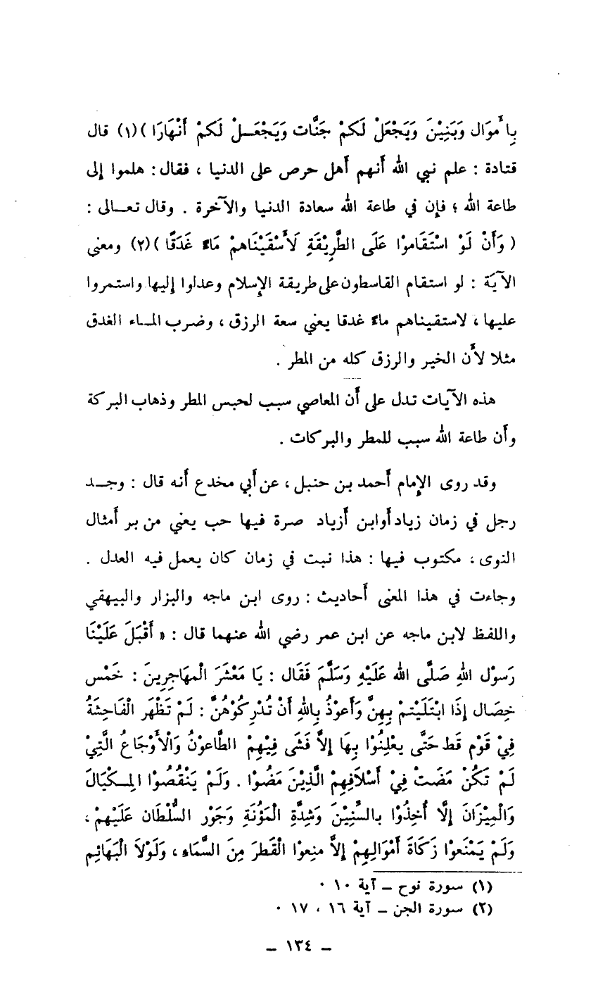 بأموال وبنين ويجعل لكم جنات ويجعل لكم أنهاراً} (¬1) قال قتادة: علم نبي الله أنهم أهل حرص على الدنيا، فقال: هلموا إلى طاعة الله، فإن في طاعة الله سعادة الدنيا والآخرة. وقال تعالى {وأن لو استقاموا على الطريقة لأسقيناهم ماءً غدقاً} (¬2) ومعنى الآية: لو استقام القاسطون على طريقة الإسلام وعدلوا إليها واستمروا عليها، لاستقيناهم ماءً غدقا يعني سعة الرزق، وضرب الماء الغدق مثلاً لأن الخير والرزق كله من المطر.