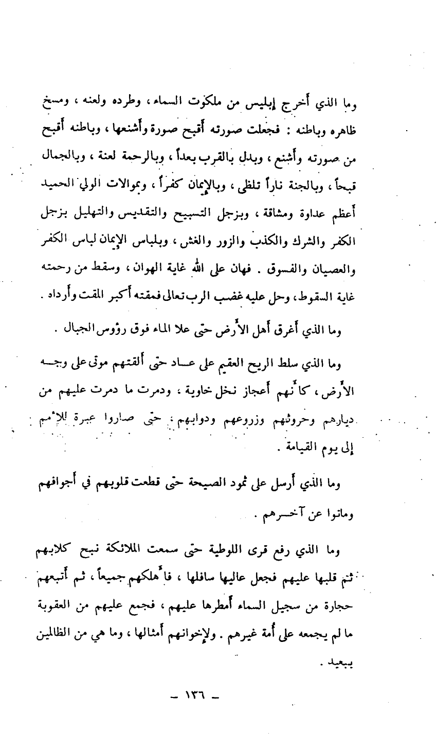 وما الذي أخرج إبليس من ملكوت السماء، وطرده ولعنه، ومسخ ظاهره وباطنه: فجعلت صورته أقبح صورة وأشنعها، وباطنه أقبح من صورته وأشنع، وبدل بالقرب بعداً، وبالرحمة لعنة، وبالجمال قبحاً، وبالجنة ناراً تلظى، وبالإيمان كفراً، وبموالات الولي الحميد أعظم عداوة ومشاقة، وبزجل التسبيح والتقديس والتهليل بزجل الكفر وال شرك والكذب والزور الغش، وبلباس الإيمان لباس الكفر والعصيان والفسوق، فهان على الله غاية الهوان، وسقط من رحمته غاية السقوط، وحل عليه غضب الرب تعالى فمقته أكبر المقت وأرداه.