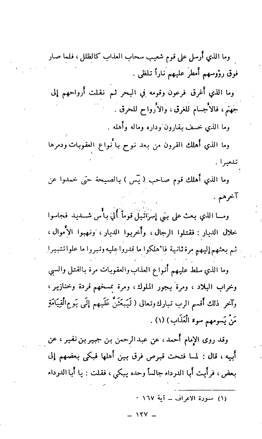 وقد روى الإمام أحمد، عن عبد الرحمن بن جبير بن نفير، عن أبيه، قال: لما فتحت قبرص فرق بين أهلها فبكى بعضهم إلى بعض، فرأيت أبا الدرداء جالساً وحده يبكي، فقلت: ياأبا الدرداء