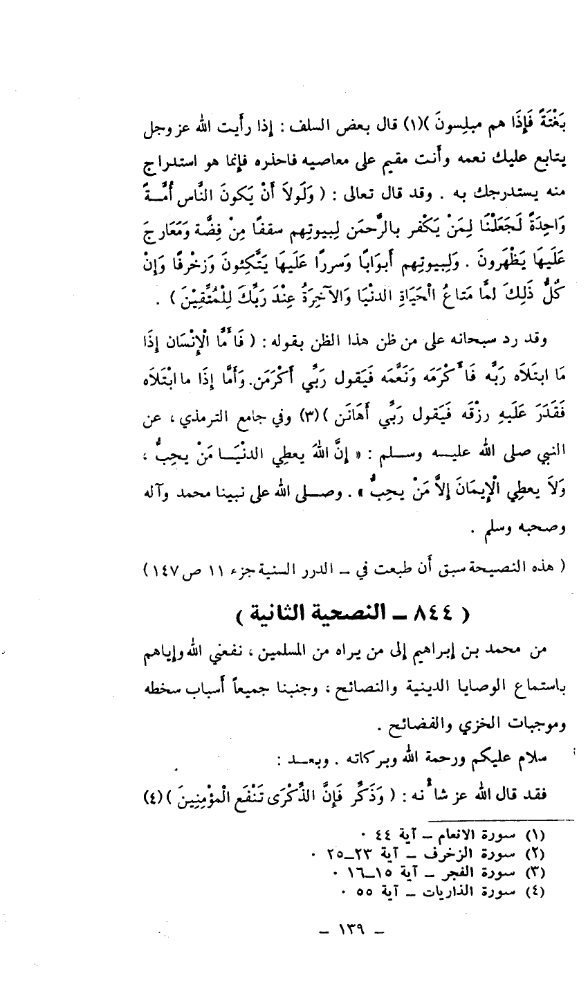 من محمد بن إبراهيم إلى من يراه المسلمين، نفعني الله وإياهم باستماع الوصايا الدينية والنصائح، وجنبنا جميعاً أسباب سخطه وموجبات الخزي والفضائح.