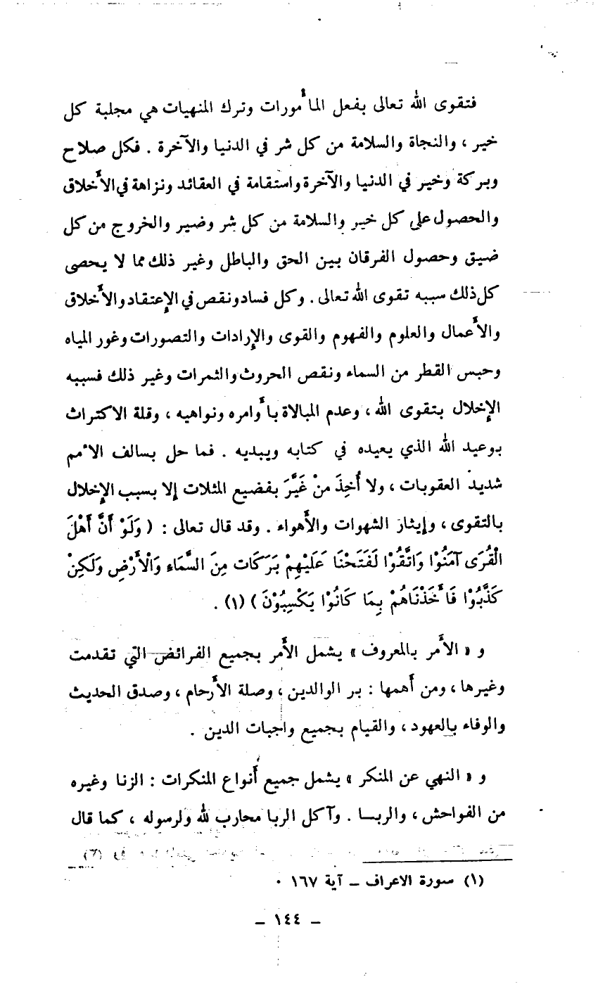 و" الأمر بالمعروف" يشمل الأمر بجميع الفرائض التي تقدمت وغيرها، ومن أهمها: بر الوالدين، وصلة الأرحام، وصدق الحديث والوفاء بالعهود، والقيام بجميع أنوا ع المنكرات: الزنا وغيره من الفواحش، والربا، وآكل الربا محارب لله ولرسوله، كما قال