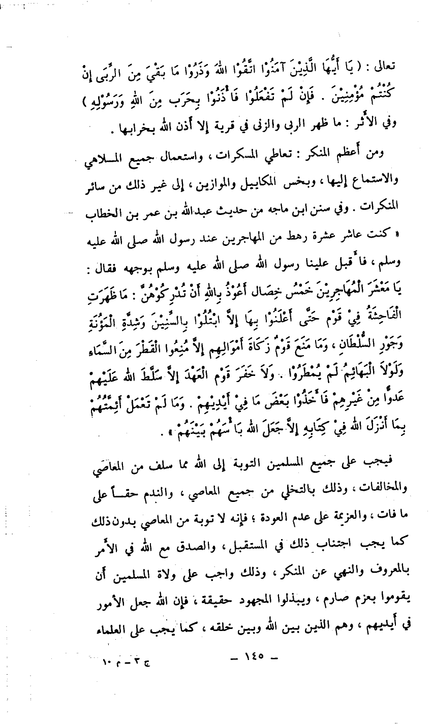 ومن أعظم المنكر: تعاطي المسكرات، واستعمال جميع الملاهي والاستماع إليها، وبخس المكاييل والموازين، إلى غير ذلك من سائر المنكرات، وفي سنن ابن ماجه من حديث عبد الله بن عمر بن الخطاب: " كنت عاشر عشرة رهط من المهاجرين عند رسول الله صلى الله عليه وسلم، فأقبل علينا رسول الله صلى الله عليه وسلم بوجهه فقال: يامعشر المهاجرين خمس خصال أعوذ بالله أن تدركوهن: ماظهرت الفاحشة في قوم حتى أعلنوا بها إلا ابتلوا بالسنين وشدة المؤنة وجور السلطان، وما منع قوم زكاة أموالهم إلا منعوا القطر من السماء ولولا البهائم لم يمطروا، ولا خفر قوم العهد إلا سلط الله عليهم عذواً من غيرهم فأخذوا بعضهم بعض ما في أيديهم، وما لم تعمل أئمتهم بما أنزل الله في كتابه إلا جعل الله بأسهم بينهم ".::::::