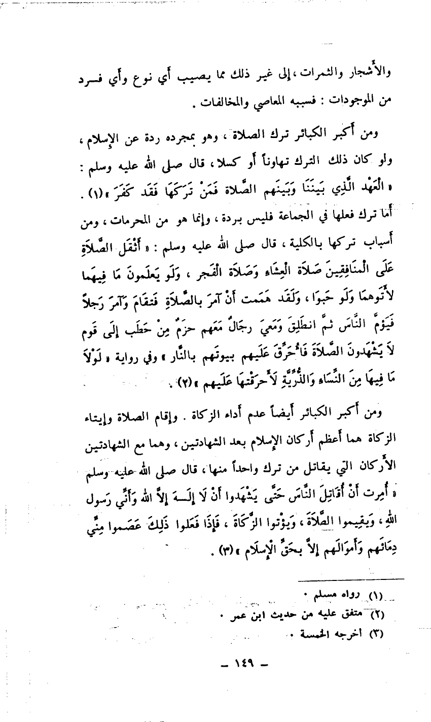 ومن أكبر الكبائر أيضاً عدم أداء الزكاة، وإقام الصلاة وإ يتاء الزكاة هما أعظم أركان الإسلام بعد الشهادتين، وهما مع الشهادتين الأركان التي يقاتل من ترك واحداً منها، قال صلى الله عليه وسلم " أمرت أن أقاتل الناس حتى يشهدوا أن لا إله إلا الله وأني رسول الله، ويقيموا الصلاة، ويؤتوا الزكاة، فإذا فعلوا ذلك عصموا مني دمائهم وأموالهم إلا بحق الإسلام (¬3) .