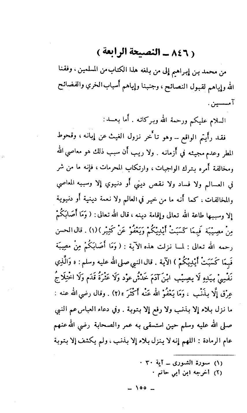 من محمد بن إبراهيم إلى من بلغه هذا الكتاب من المسلمين، وفقنا الله وإياهم لقبول النصائح، وجنبنا وإياهم أسباب الخري والفضائح آمين.