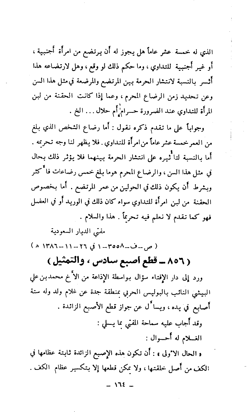 ورد إلى دار الإفتاء سؤال بواسطة الإذاعة من الأخ محمد بن علي البيشي النائب بالبوليس الحربي يمنطقة جدة عن غلام ولد وله ستة أصابع في يده، ويسال عن جواز قطع الأصبع الزائدة.