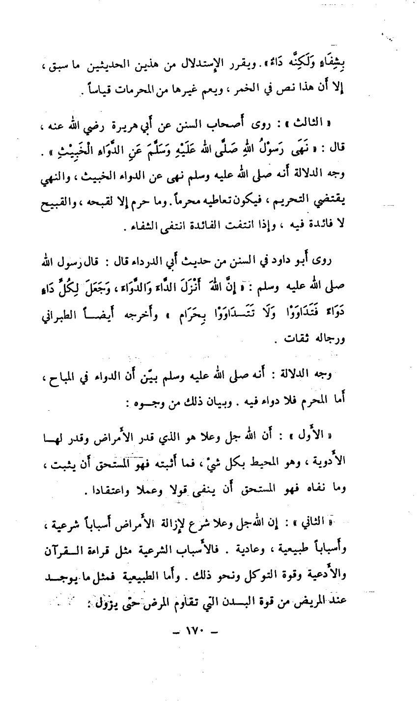 بشفاء ولكنه داء " ويقرر الاستدلال من هذين الحديثين ما سبق، إلا أن هذا نص في الخمر، ويعم غيرها من المحرمات قياساً.
