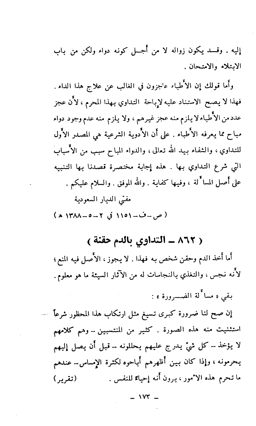 إن صح لنا ضرورة كبرى تسيغ مثل ارتكاب هذا المحظور شرعاً استثنيت منه هذه الصورة، كثير من المنتسبين ـ وهم كلامهم لا يؤخذ ـ كل شيء يدرج ع ليهم يحللونه ـ قبل أن يصل إليهم يحرمونه، وإذا كان بين أظهرهم أباحوه لكثرة الإمساس ـ عندهم ما تحرم هذه الأمور، يرون أن إحياء للنفس (تقرير) .