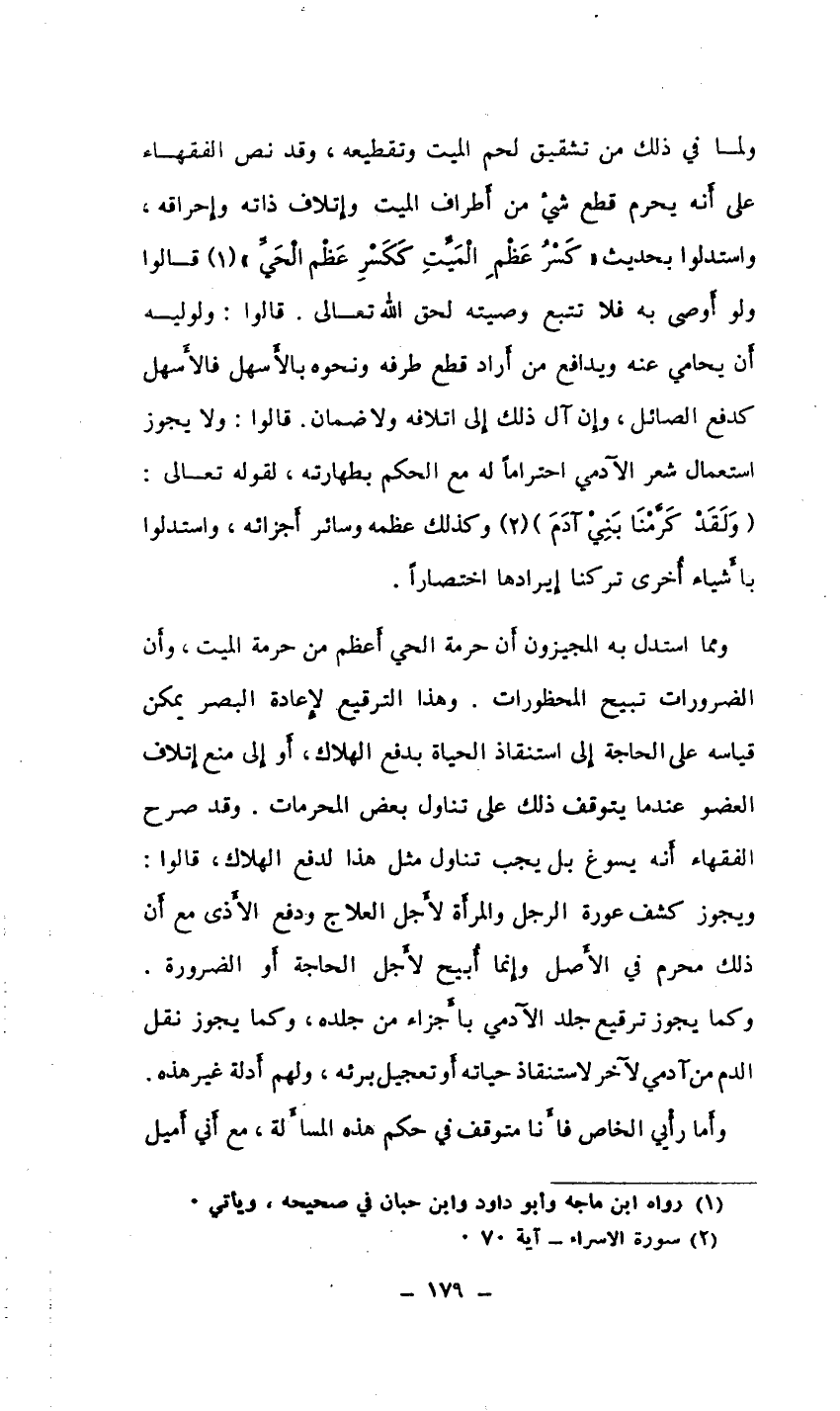 ولما في ذلك من تشقيق لحم الميت وتقطيعه، وقد نص الفقهاء على أنه يحرم قطع شيء من أطراف الميت وإتلاف ذاته وإحراقه، واستدلوا بحديث " كسر عظم الميت ككسر عظم الحي" (¬1) قالوا ولو أوصى به فلا تتبع وصيته لحق الله تعالى. قالوا: ولوليه أن يحامي عنه ويدافع من أراد قطع طرفه ونحوه بالأسهل فالأسهل كدفع الصائل، وإن آل ذلك إلى اتلافه ولا ضمان. قالوا: ولا يجوز استعمال شعر الآدمي احتراماً له مع الحكم بطهارته، لقوله تعالى: {ولقد كرمنا بني آدم} (¬2) وكذلك عظمه وسائر أجزائه، واستدلوا بأشياء أخرى تركنا إيرادها اختصاراً.