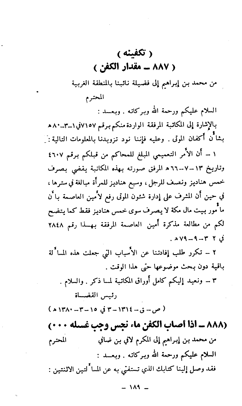 1 ـ أن الأمر التعميمي المبلغ للمحاكم من قبلكم برقم 4607 وتاريخ 13/7/66هـ المرفق صورته بهذه المكاتبة يقضي بصرف خمس هناديز ونصف للرجل، وسبع هناديز للمرأة مبالغة في سترها، في حين أن المشرف على إدارة شئون الموتى رفع لأمين العاصمة بأن مأمور بيت مال مكة لا يصرف سوى خمس هناديز فقط كما يتضح لكم من مطالعة مذكرة أمين العاصمة المرفقة بهذا رقم 2848 في 2ـ 3/9/79هـ.