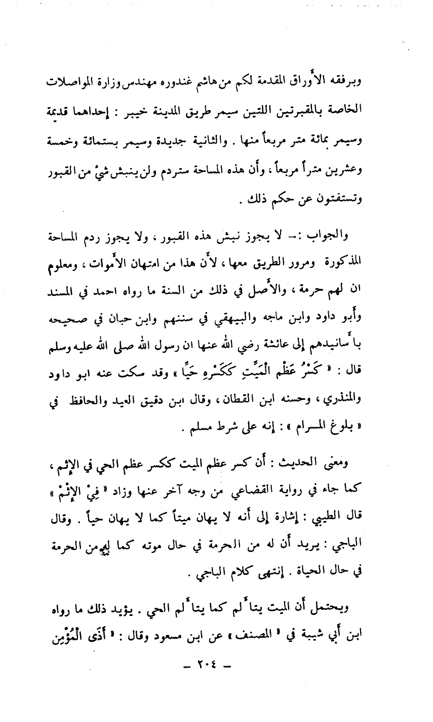والجواب: لا يجوز نبش هذه القبور، ولا يجوز ردم المساحة المذكورة ومرور الطريق معها، لأن هذا من امتهان الأموات، ومعلوم أن لهم حرمة، والأصل في ذلك من السنة مارواه أحمد في المسند وأبو داود وابن ماجه والبيهقي في سننهم وابن حبان في صحيحه بأسانيدهم إلى عائشة رضي الله عنها أن رسول الله صلى الله عليه وسلم قال: " كسر عظم الميت ككسره حياً " وقد سكت عنه أبو داود والمنذري، وحسنه ابن القطان، وقال ابن دقيق العيد والحافظ في " بلوغ المرام" إنه على شرط مسلم.