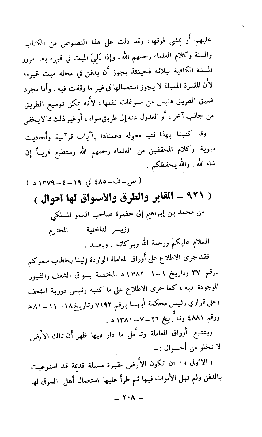 فقد جرى الاطلاع على أوراق المعاملة الواردة إلينا بخطاب سموكم برقم 37 وتاريخ 1/1/1382هـ المختصة بسوق الشعف والقبور الموجودة فيه، كما جرى الاطلاع على ما كتبه رئيس دورية الشعف وعلى قراري رئيس محكمة أبها برقم 7192 وتاريخ 18/11/81هـ ورقم 4881 وتاريخ 26/7/1381هـ