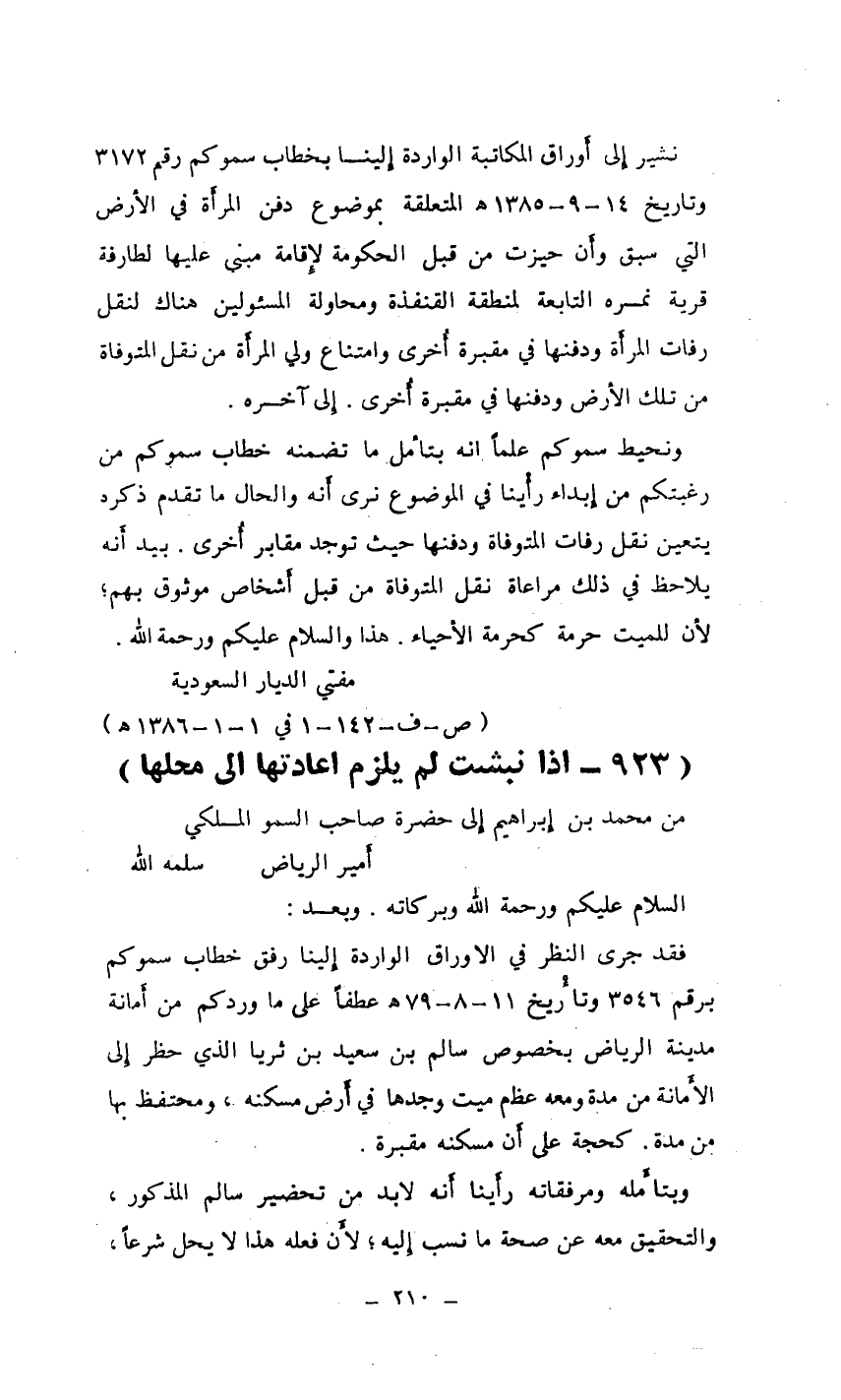 نشير إلى أوراق المكاتبة الواردة إلينا بخطاب سموكم رقم 3172 وتاريخ 14/9/1385هـ المتعلقة بموضوع دفن المرأة في الأرض التي سبق وأن حيزت من قبل الحكومة لإقامة مبنى عليها لطارفة قرية نمره التابعة لمنطقة القنفذة ومحاولة المسئولين هناك لنقل رفات المرأة ودفنها في مقبرة أخرى وامتناع ولي المرأة من نقل المتوفاة من تلك الأرض ودفنها في مقبرة أخرى. على آخره.
