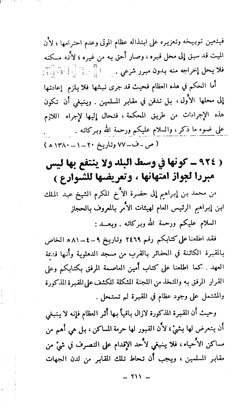 فقد اطلعنا على كتابكم رقم 2469 وتاريخ 9/4/1381هـ الخاص بالمقبرة الكائنة في الحفائر بالقرب من مسجد الدهلوية وأنها قديمة العهد. كما اطلعنا على كتاب أمين العاصمة المرفق بكتابكم وعلى القرار المرفق به والمتخذ من اللجنة المشكلة للكشف على المقبرة المذكورة والمشتمل على وجود عظام في المقبرة لم تستحل.