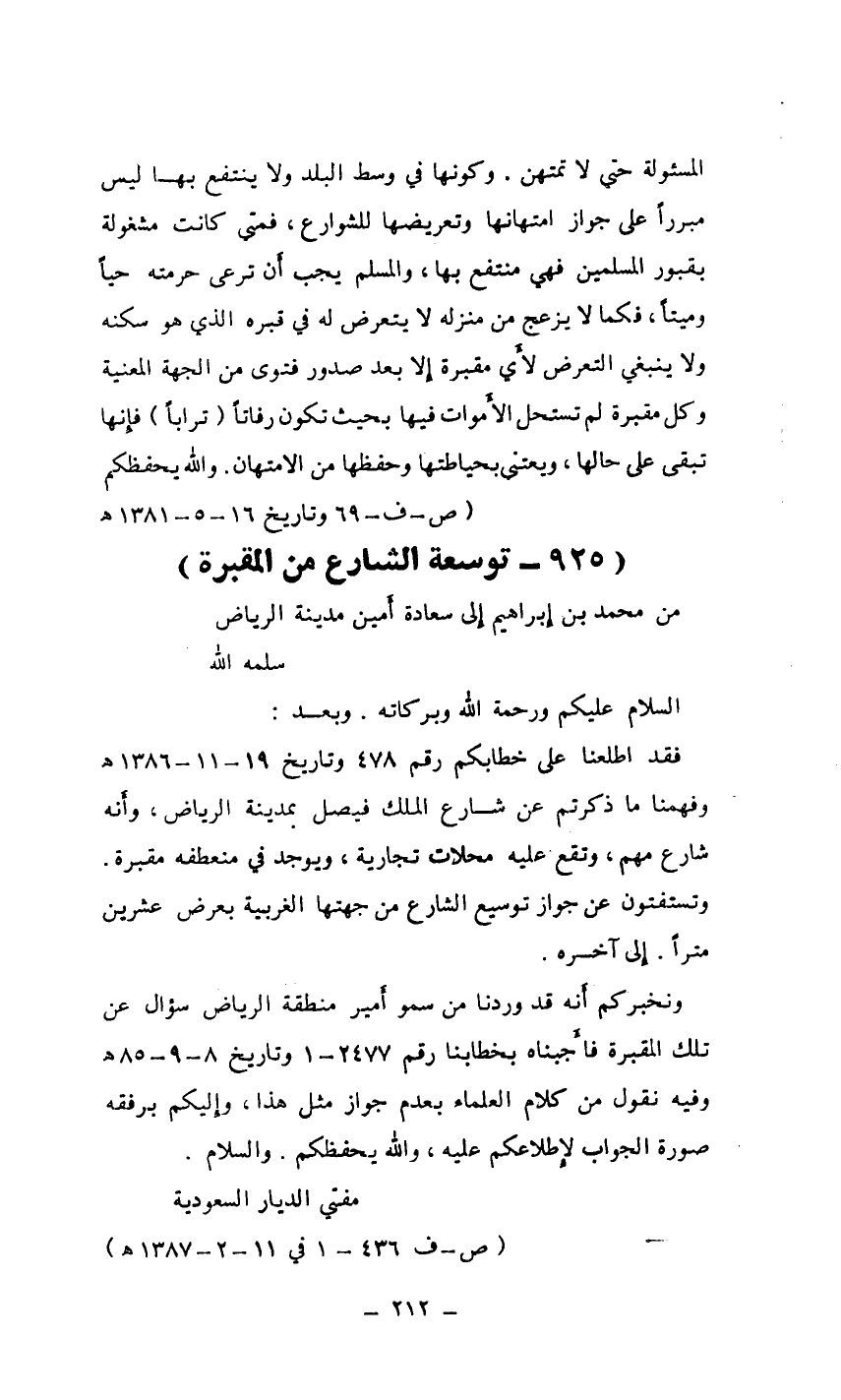 فقد اطلعنا على خطابكم رقم 478 وتاريخ 19/11/1386هـ وفهمنا ما ذكرتم عن شارع الملك فيصل بمدينة الرياض، وأنه شارع مهم، وتقع عليه محلات تجارية، ويوجد في منعطفه مقبرة. وتستفتون عن جواز توسيع الشارع من جهتها الغربية بعرض العشرين متراً. إلى آخره.