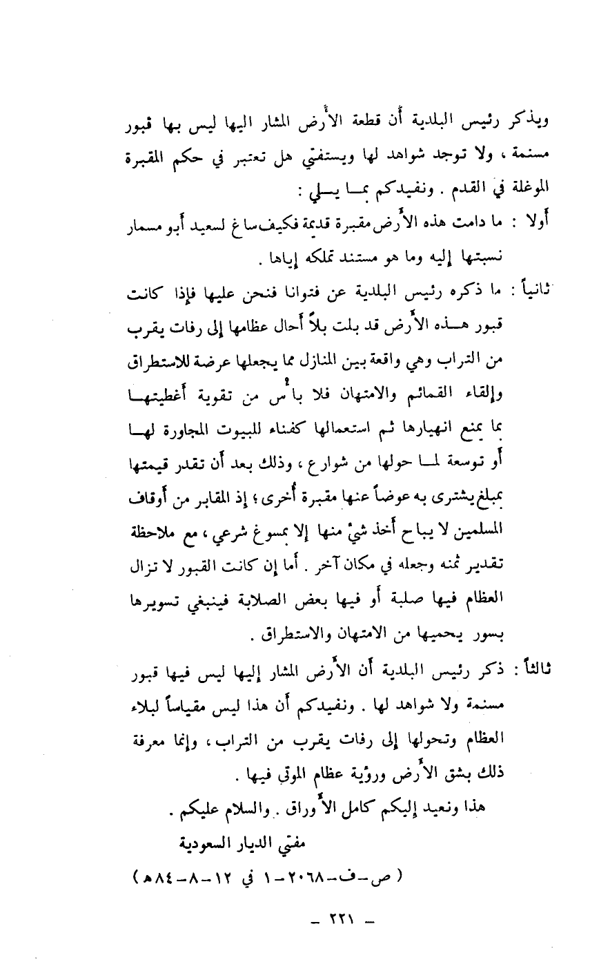ثانياً: ماذكره رئيس البلدية عن فتوانا فنحن عليها فإذا كانت قبور هذه الأرض قد بلت بلاً أحال عظامها إلى رفات يقرب من التراب وهي واقعة بين المنازل مما يجعلها عرضة للاستطراق وإلقاء القمائم والامتهان فلا بأس من تقوية أغطيتها بما يمنع انهيارها ثم استعمالها كفناء للبيوت المجاورة لها أو توسعة لما حولها من شوارع، وذلك بعد أن تقدر قميتها بمبلغ يشتري به عوضاً عنها مقبرة أخى، إذ المقابر من أوقاف المسلمين لا يباح أخذ شيء منها إلا بمسوغ شرعي، مع ملاحظة تقدير ثمنه وجعله في مكان آخر.