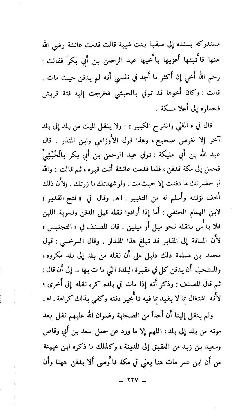 ولم ينقل إلينا أن أحداً من الصحابة رضوان الله عليهم نقل بعد موته من بلد إلى بلد، اللهم إلا ما ورد عن حمل سعد بن أبي وقاص وسعيد بن زيد من العقيق إلى المدينة، وكذلك ما ذكره ابن عيينة من أن ابن عمر مات هنا يعني في مكة فأوصى ألا يدفن ههنا وأن