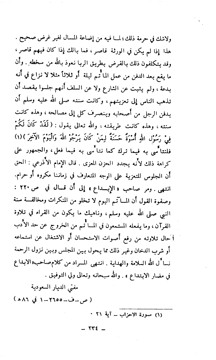 ومر صاحب " الإبداع " إلى أن قال في ص220: وصفوة القول أن المآتم اليوم لا تخلو من المنكرات ومخالفة سنة النبي صلى الله عليه وسلم، وناهيك ما يكون من القراء في تلاوة القرآن، وما يفعله المستمعون في المأتم من الخروج عن حد الأدب حال تلاوته من رفع أصوات الاستحسان أو الاشتغال عن استماعه أو شرب الدخان وغير ذلك مما يحول بين المجلس وبين نزول الرحمة نسأل الله السلامة والهداية. انتهى المراد من كلام صاحب " الابداع في مضار الابتداع" والله سبحانه وتعالى ولي التوفيق.