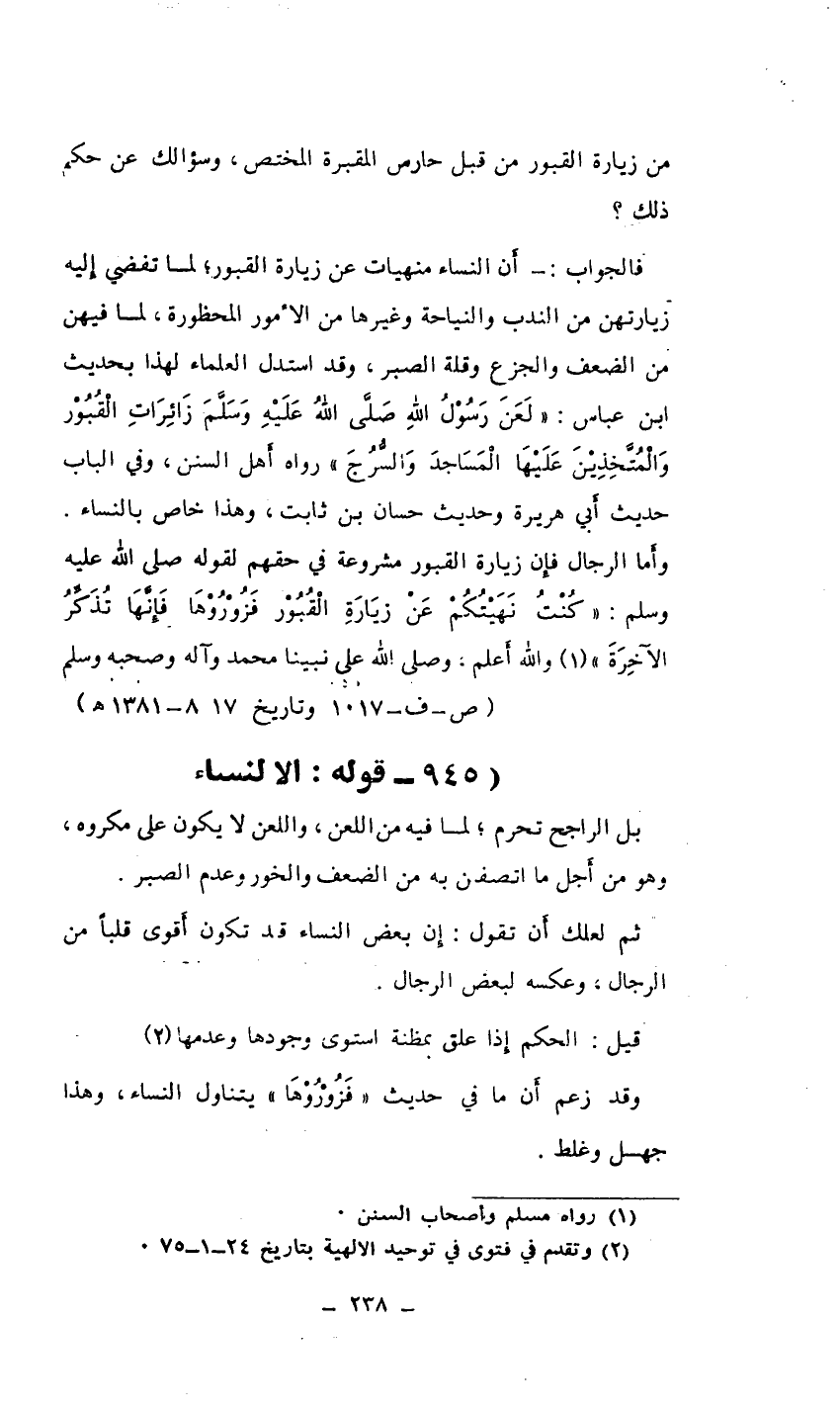 فالجواب: أن النساء منهيات عن زيارة القبور، لما تفضي إليه زيارتهن من الندب والنياحة وغيرها من الأمور المحظورة، لما فيهن من الضعف والجزع وقلة الصبر، وقد استدل العلماء لهذا بحديث ابن عباس: " لعن رسول الله صلى الله عليه وسلم زائرات القبور والمتخذين عليها المساجد والسراج" رواه أهل السنن، وفي الباب حديث أبي هريرة وحديث حسان بن ثابت، وهذا خاص بالنساء.