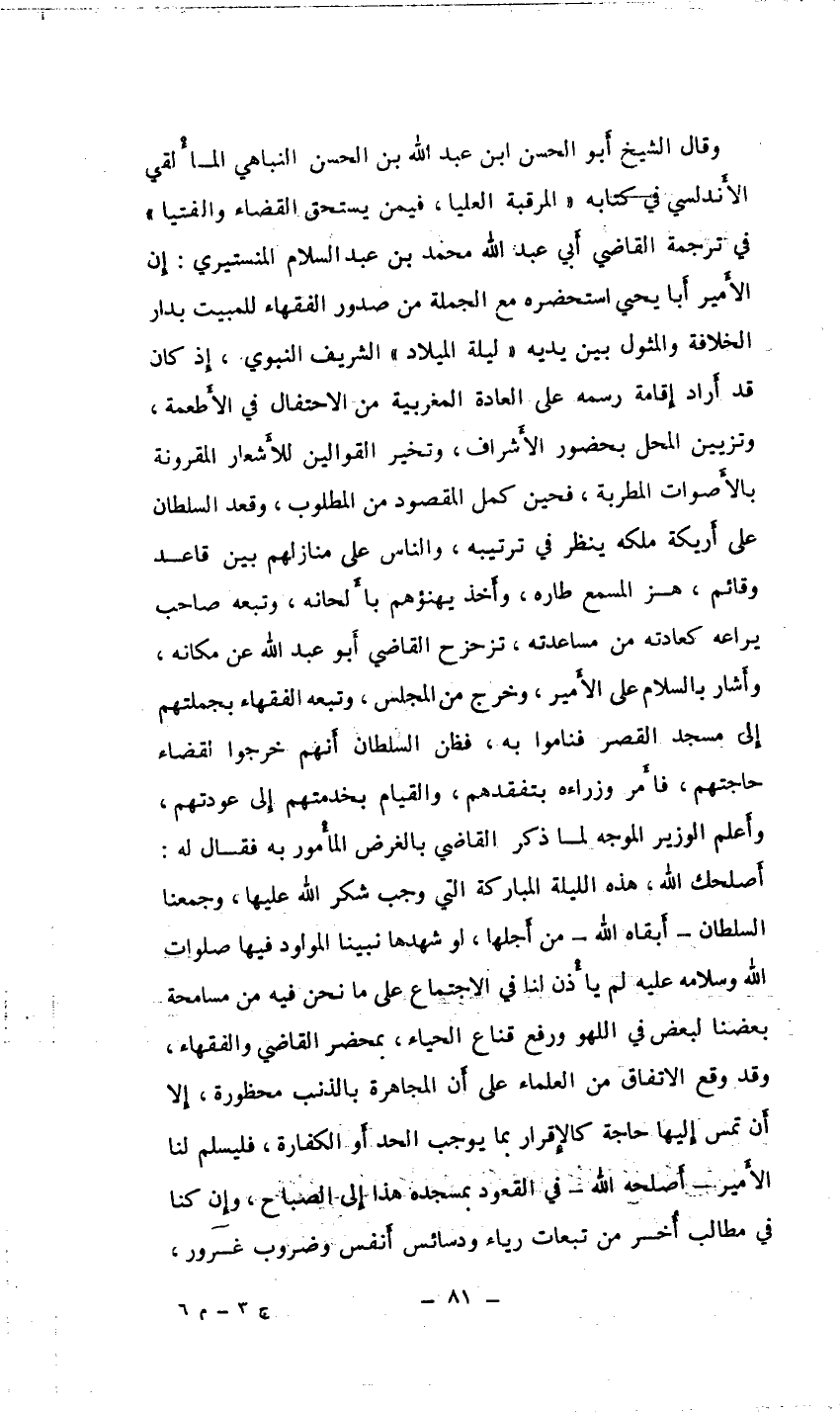 وقال الشيخ أبو الحسن ابن عبد الله بن الحسن النباهي المالقي الأندلسي في كتابه " المرقبة العليا، فيمن يستحق القضاء والفتيا " في ترجمة القاضي أبي عبد الله محمد بن عبد السلام المنستيري: إن الأمير أبا يحيى استحضره مع الجملة من صدور الفقهاء للبيت بدار الخلافة والمثول بين يديه " ليلة الميلاد " الشريف النبوي، إذ كان قد أراد إقامة رسمه على العادة المغربية من الاحتفال في الأطعمة، وتزيين المحل بحضور الأشراف، وتخير القوالين للأشعار المقرونة بالأصوات المطربة فحين كمل المقصود من المطلوب، وقعد السلطان على أريكة ملكه ينظر في ترتيبه، والناس على منازلهم بين قاعد وقائم، هز المسمع طاره، وأخذ يهنؤهم بألحانه، وتبعه صاحب يراعه كعادته من مساعدته، تزحزح القاضي أبو عبد الله عن مكانه، وأشار بالسلام على الأمير، وخرج من المجلس، وتبعه الفقهاء بجملتهم إلى مسجد القصر فناموا به.::::::