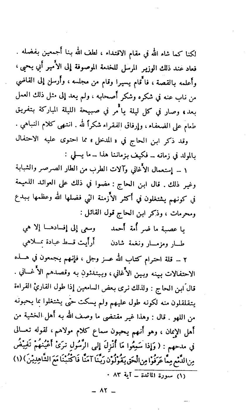 قال ابن الحاج: ولذلك نرى بعض السامعين إذا طول القارئ القراءة يتقلقلون منه لكونه طول عليهم ولم يسكت حتى يشتغلوا بما يحبونه من اللهو قال: وهذا غير مقتضى ماوصف الله به أهل الخشية من أهل الإيمان، وهو أنهم يحبون سماع كلام مولاهم، لقوله تعالى في مدحهم: {وإذا سمعوا ماأُنزل إلى الرسول ترى أعينهم تفيض من الدمع مما عرفوا من الحق يقولون ربنا آمنا فاكتبنا مع الشاهدين} (¬1)