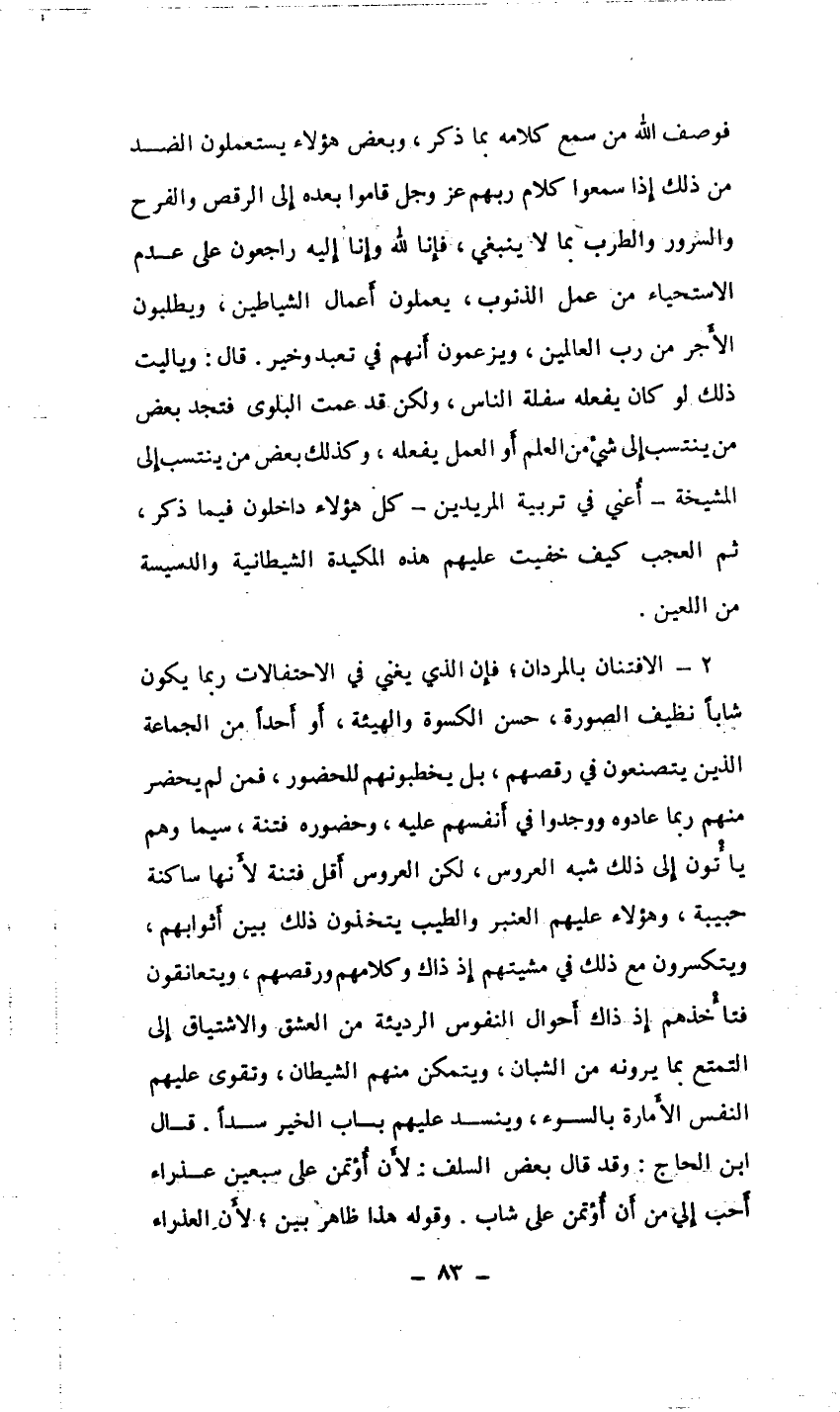 2 ـ الافتتان بالمردان، فإن الذي يغني في الاحتفالات ربما يكون شاباً نظيف الصورة، حسن الكسوة والهيئة، أو أحداً من الجماعة الذين يتصنعون في رقصهم، بل يخطبونهم للحضور، فمن لم يحضر منهم ربما عادوه ووجدوا في أنفسهم عليه، وحضوره فتنة، سيما وهم يأتون إلى ذلك شبه العروس، لكن العروس أقل فتنة لأنها ساكنة حبيبة، وهؤلاء عليهم العنبر والطيب يتخذون ذلك بين أثوابهم، ويتكسرون مع ذلك في مشيتهم إذ ذاك وكلامهم ورقصهم، ويتعانقون فتأخذهم إذ ذاك أحوال النفوس الرديئة من العشق والاشتياق إلى التمتع بما يرونه من الشبان، ويتمكن منهم الشيطان، وتقوى عليهم النفس الأمارة بالسوء، وينسد عليهم باب الخير سداً. قال ابن الحاج: وقد قال بعض السلف: لأن أؤتمن على سبعين عذراء أحب إليّ من أن أؤتمن على شاب وقوله هذا ظاهر بين، لأن العذراء