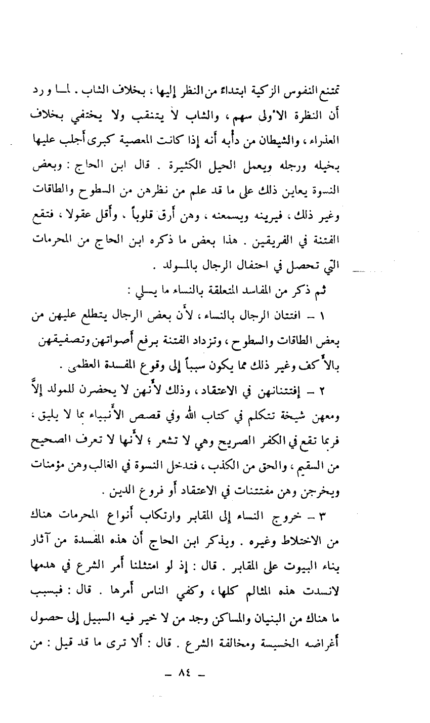 تمتنع النفوس الزكية ابتداء من النظر إليها، بخلاف الشاب، لما ورد أن النظرة الأولى سهم، والشاب لا يتنقب ولا يختفي بخلاف العذراء، والشيطان من دأبه أنه إذا كانت المعصية كبرى أجلب عليها بخيله ورجله ويعمل الحيل الكثيرة، قال ابن الحاج: وبعض النسوة يعاين ذلك على ما قد علم من نظرهن من السطوح والطاقات وغير ذلك. فيرينه ويسمعنه، وهن أرق قلوباً. وأقل عقولاً، فتقع الفتنة في الفريقين. هذا بعض ما ذكره ابن الحاج من المحرمات التي تحصل في احتفال الرجال بالمولد.