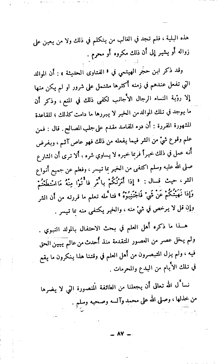 وقد ذكر ابن حجر الهيثمي في " الفتاوى الحديثية" أن الموالد التي تفعل عندهم في زمنه أكثرها مشتمل على شرور أو لم يكن منها إلا رؤية النساء الرجال الأجانب لكفى ذلك في المنع، وذكر أن مايوجد في تلك الموالد من الخير لا يبررها ما دامت كذلك، للقاعدة المشهورة المقررة: أن درء المفاسد مقدم على جلب المصالح قال: فمن علم وقوع شيء من الشر فيما يفعله من ذلك فهو عاص آثم، وبفرض أنه عمل في ذلك خيراً فربما خيره لا يساوي شره، ألا ترى أن الشارع صلى الله عليه وسلم اكتفى من الخير بما تيسر، وفطم عن جميع أنواع الشر، حيث قال: " إذا أمرتكم بأمر فأتوا منه ما استطعتم وإذا نهيتكم عن شيء فاجتنبوه " فتأمله تعلم ما قررته من أن الشر وإن قل لا يرخص في شيء منه، والخير يكتفى منه بما تيسر.