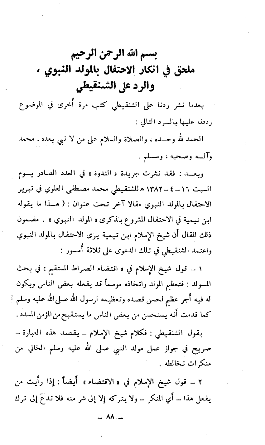 وبعد: فقد نشرت جريدة " الندوة" في العدد الصادر يوم السبت 16/4/1382هـ للشنقيطي محمد مصطفى العلوي في تبرير الاحتفال بالمولد النبوي مقالاً آخر تحت عنوان (هذا ما يقوله ابن تيمية في الاحتفال المشروع بذكرى " المولد النبوي" مضمون ذلك المقال أن شيخ الإسلام ابن تيمية يرى الاحتفال بالمولد النبوي واعتمد الشنقيطي في تلك الدعوى على ثلاثة أمور: