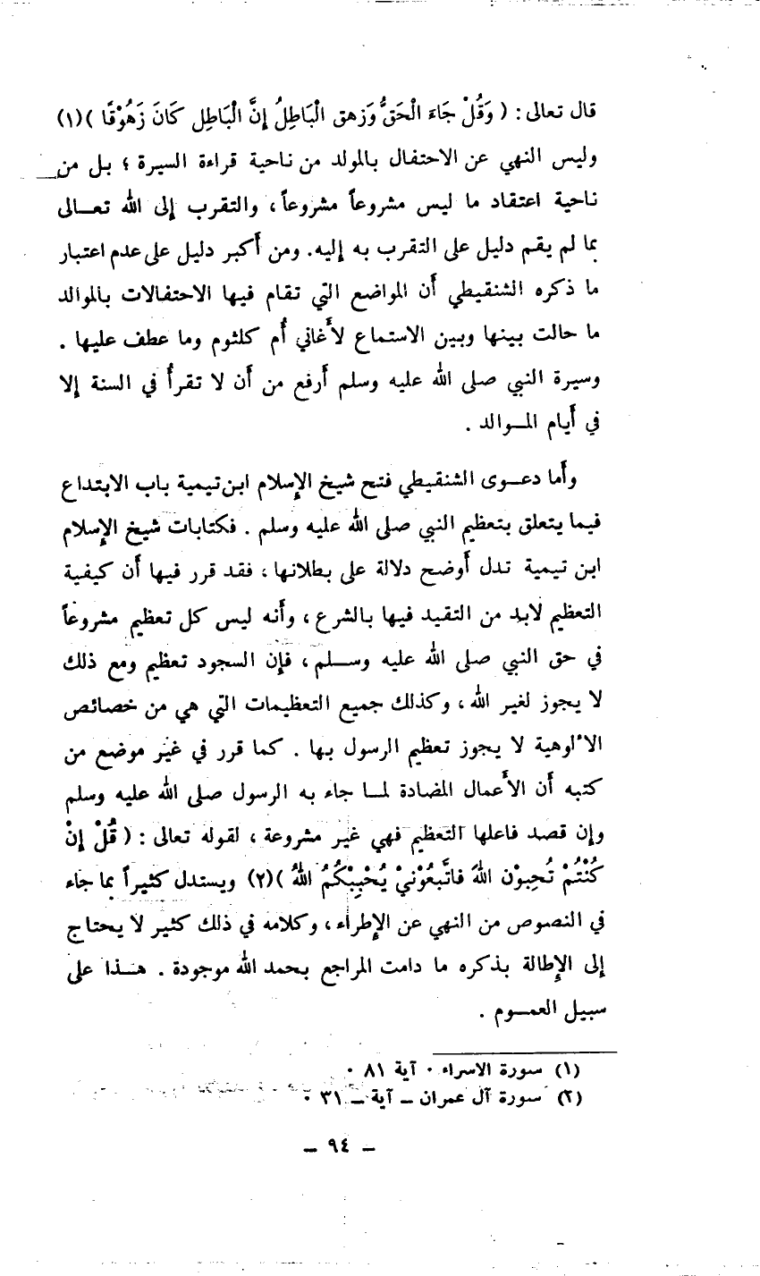 وأما دعوى الشنقيطي فتح شيخ الإسلام ابن تيمية باب الابتداع فيما يتعلق بتعظيم النبي صلى الله عليه وسلم فكتابات شيخ الإسلام ابن تيمية تدل أوضح دلالة على بطلانها، فقد قرر فيها أن كيفية التعظيم لابد من التقيد فيها بالشرع، وأنه ليس كل تعظيم مشروعاً في حق النبي صلى الله عليه وسلم، فإن السجود تعظيم ومع ذلك لا يجوز لغير الله، وكذلك جميع التعظيمات التي هي من خصائص الألوهية لا يجوز تعظيم الرسول بها، كما قرر في غير موضع من كتبه أن الأعمال المضادة لما جاء به الرسول صلى الله عليه وسلم وإن قصد فاعلها التعظيم فهي غير مشروعة، لقوله تعالى: {قل إن كنتم تحبون الله فاتبعوني يحببكم الله} (¬2) ويستدل كثيراً بما جاء في النصوص من النهي عن الإطراء، وكلامه في ذلك كثير لا يحتاج إلى الإطالة بذكره مادامت المراجع بحمد الله موجودة، هذا على سبيل العموم.