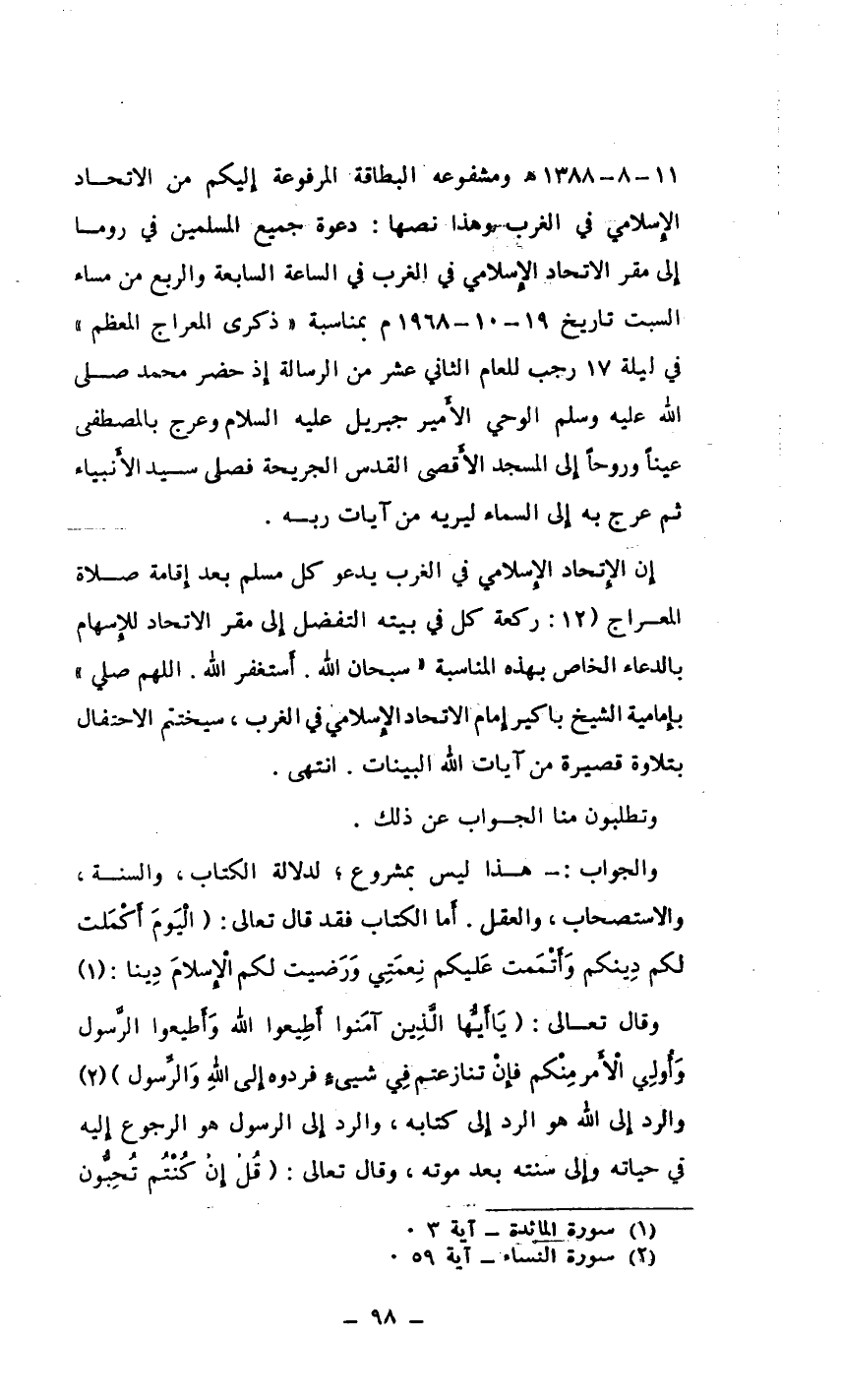 11/8/1388هـ ومشفوعه البطاقة المرفوعة إليكم من الاتحاد الإسلامي في الغرب وهذا نصها: دعوة جميع المسلمين في روما إلى مقر الاتحاد الإسلامي في الغرب وهذا نصها: دعوة جميع المسلمين في روما إلى مقر الاتحاد الإسلامي في الغرب في الساعة السابعة والربع من مساء السبت تاريخ 19/10/1968م بمناسبة " ذكرى المعراج المعظم" في ليلة 17 رجب للعام الثاني عشر من الرسالة إذ حضر محمد صلى الله عليه وسلم الوحي الأمير جبريل عليه السلام وعرج بالمصطفى عيناً وروحاً إلى المسجد الاقصى القدس الجريحة فصلى سيد الأنبياء ثم عرج به إلى السماء ليريه من آيات ربه.::::::
