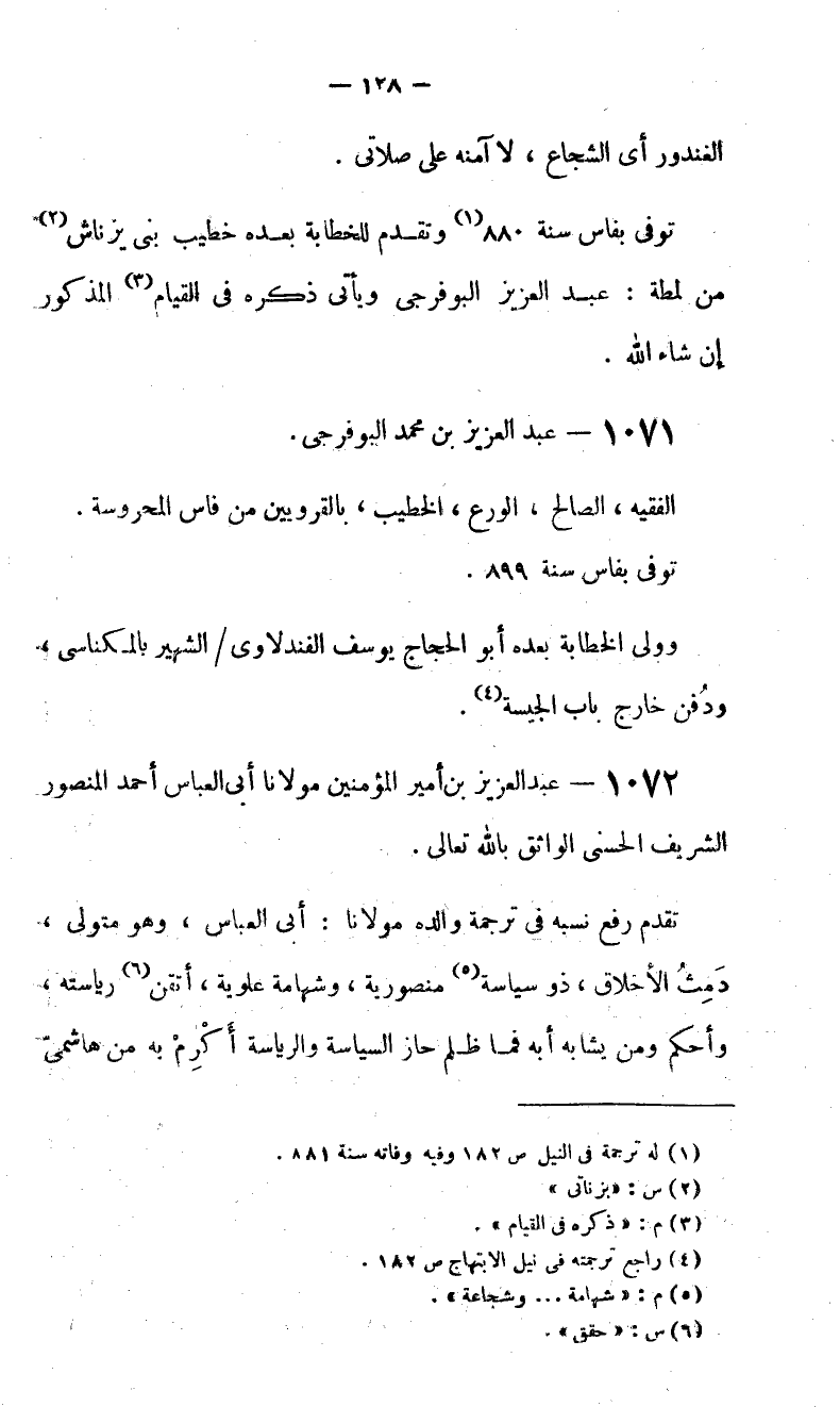 توفى بفاس سنة 880 (1) وتقدم للخطابة بعده خطيب بنى يزناش (2) من لمطة: عبد العزيز البوفرجى ويأتى ذكره فى القيام (3) المذكور إن شاء الله.