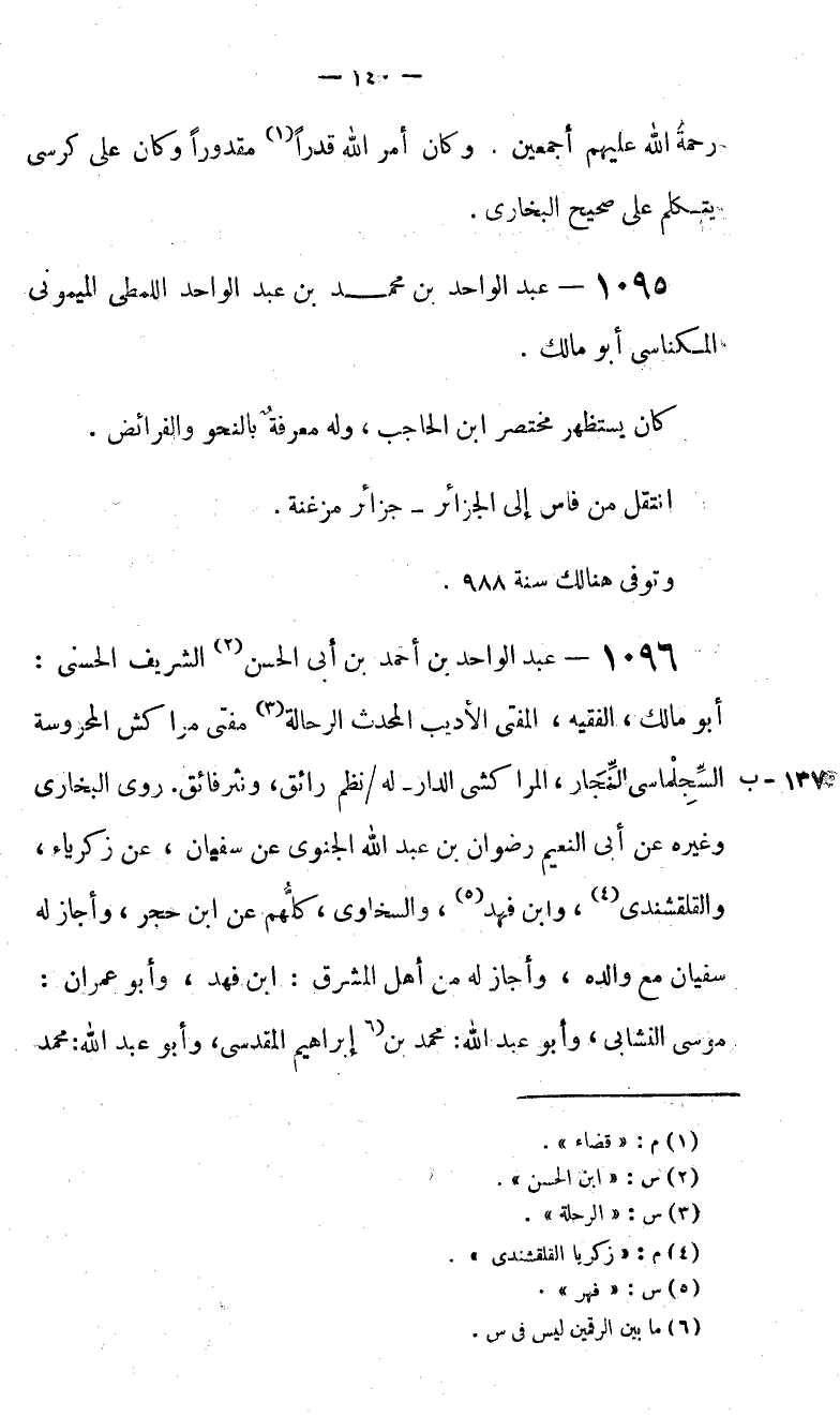 الشريف الحسنى: أبو مالك، الفقيه، المفتى الأديب المحدث الرحالة (3) مفتى مراكش المحروسة السّجلماسى النّجار، المراكشى الدار-له/نظم رائق، ونثر فائق. روى البخارى وغيره عن أبى النعيم رضوان بن عبد الله الجنوى عن سفيان، عن زكرياء، والقلقشندى (4)، وابن فهد (5)، والسخاوى، كلّهم عن ابن حجر، وأجاز له سفيان مع والده، وأجاز له من أهل المشرق: ابن فهد، وأبو عمران: موسى النشابى، وأبو عبد الله: محمد بن (6) إبراهيم المقدسى، وأبو عبد الله: محمد