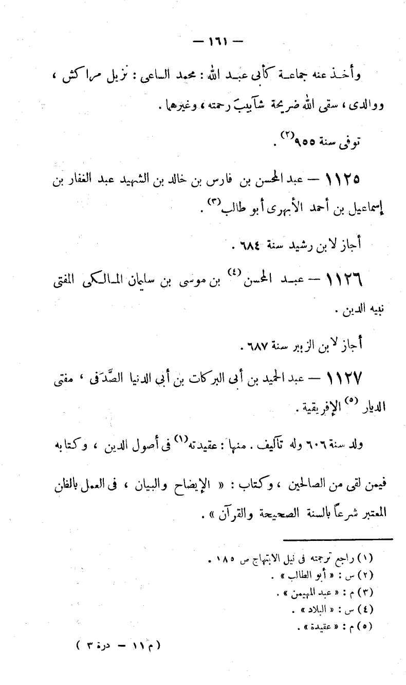 ولد سنة 606 وله تآليف. منها: عقيدته (1) فى أصول الدين، وكتابه فيمن لقى من الصالحين، وكتاب: «الإيضاح والبيان، فى العمل بالظن المعتبر شرعا بالسنة الصحيحة والقرآن».
