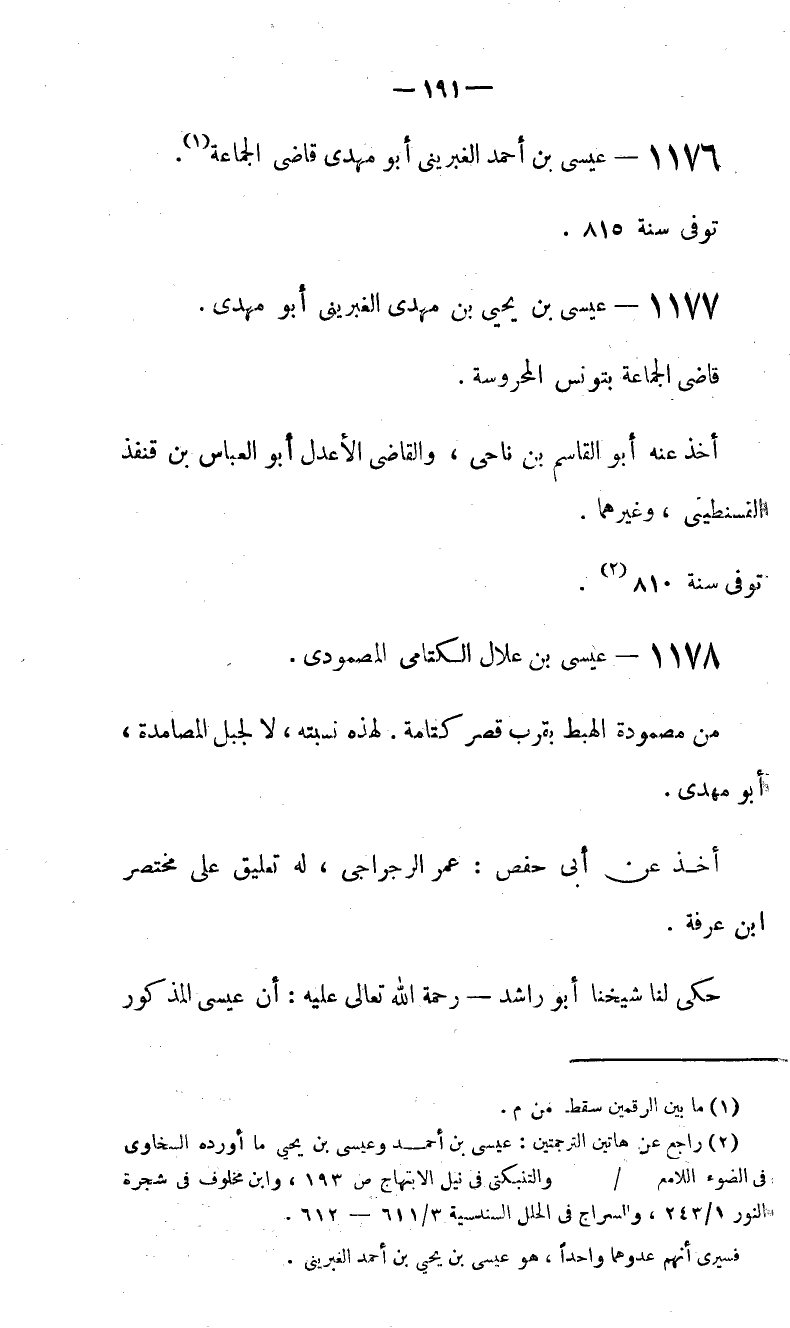 (2) راجع عن هاتين الترجمتين: عيسى بن أحمد وعيسى بن يحيى ما أورده السخاوى فى الضوء اللامع/والتنبكتى في نيل الابتهاج ص 193، وابن مخلوف في شجرة النور 1/ 243، والسراج في الحلل السندسية 3/ 611 - 612. فسيرى أنهم عدوهما واحدا، هو عيسى بن يحيى بن أحمد الغبرينى.
