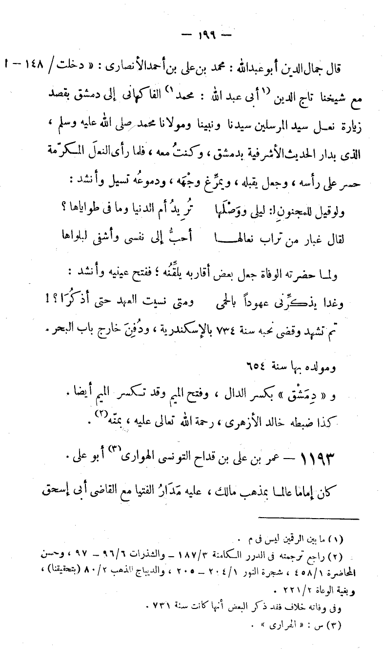 قال جمال الدين أبو عبد الله: محمد بن على بن أحمد الأنصارى: «دخلت/ مع شيخنا تاج الدين (1) أبى عبد الله: محمد (1) الفاكهانى إلى دمشق بقصد زيارة نعل سيد المرسلين سيدنا ونبينا ومولانا محمد صلّى الله عليه وسلم، الذى بدار الحديث الأشرفية بدمشق، وكنت معه، فلما رأى النعل المكرّمة حسر على رأسه، وجعل يقبله، ويمرّغ وجهه، ودموعه تسيل وأنشد: