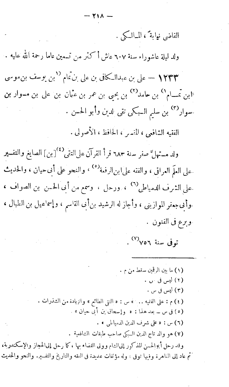 (7) هو والد تاج الدين السبكى صاحب طبقات الشافعية. وقد رحل أبو الحسن المذكور إلى الشام وولى القضاء بها، كما رحل إلى الحجاز والإسكندرية، ثم عاد إلى القاهرة وفيها توفى: وله مؤلفات عديدة في الفقه والتاريخ والتفسير. والنحو والحديث