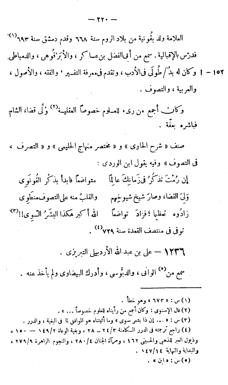 العلامة ولد بقونية من بلاد الروم سنة 668 وقدم دمشق سنة 693 (1) فدرّس بالإقبالية. سمع من أبى الفضل بن عساكر، والأبرقوهى، والدمياطى وكان له يد/طولى في الأدب، وتقدم في معرفة التفسير، والفقه، والأصول، والعربية، والتصوف.