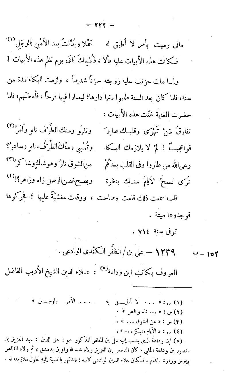 ولما مات حزنت عليه زوجته حزنا شديدا، ولزمت البكاء مدة من سنة، فلما كان بعد السنة طلبوا منها دارها؛ ليعملوا فيها فرحا، فأعطتهم، فلما حضرت المغنية غنّت هذه الأبيات: