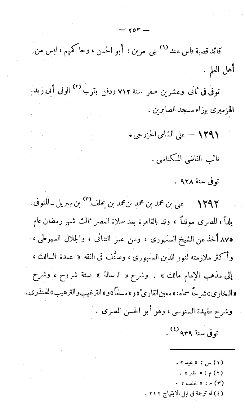 بن جبريل-المتوفى بلدا، المصرى مولدا، ولد بالقاهرة بعد صلاة العصر ثالث شهر رمضان عام 875 أخذ عن الشيخ السنهورى، وعن عمر التنائى، والجلال السيوطى، وأكثر ملازمته لنور الدين السنهورى، وصنّف في الفقه «عمدة السالك، إلى مذهب الإمام مالك». وشرح «الرسالة» بستة شروح، وشرح «البخارى» شرحا سماه: «معين القارئ» و «مسلما» و «الترغيب والترهيب» للمنذرى وشرح عقيدة السنوسى، وهو أبو الحسن المصرى.