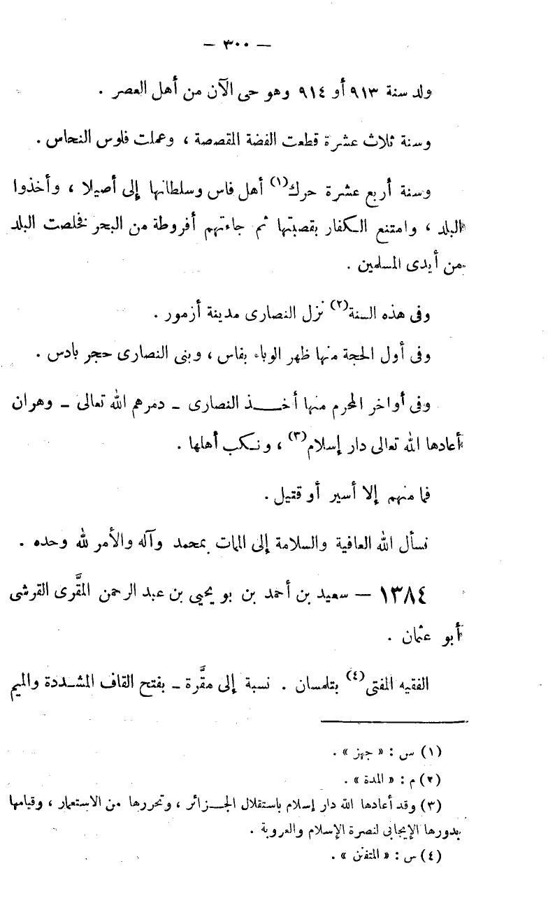 وفي أواخر المحرم منها أخذ النصارى-دمرهم الله تعالى-وهران أعادها الله تعالى دار إسلام (3)، ونكب أهلها.