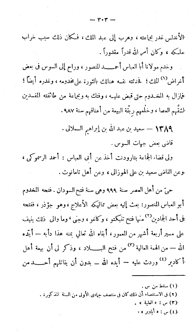 حىّ من أهل العصر سنة 999 وهى سنة فتح السودان. فتحه المخدوم أبو العباس المنصور: بعث إليه بعض مماليكه الأعلاج، وهو جؤذر، ففتحه فى أحد الجماديين (2) منها فتح تنبكتو، وكاغو، وجنى، وما والى ذلك ينيف على مسير أربعة أشهر من المعمور، أبقاه الله تعالى بمنه هذا دأبه-أيّده الله-من الهمة العالية (3) من فتح البلاد، وذكر لى أن بيعة أهل أكادير (4) وردت عليه-أيده الله-بدون أن يقاتلهم أحد من