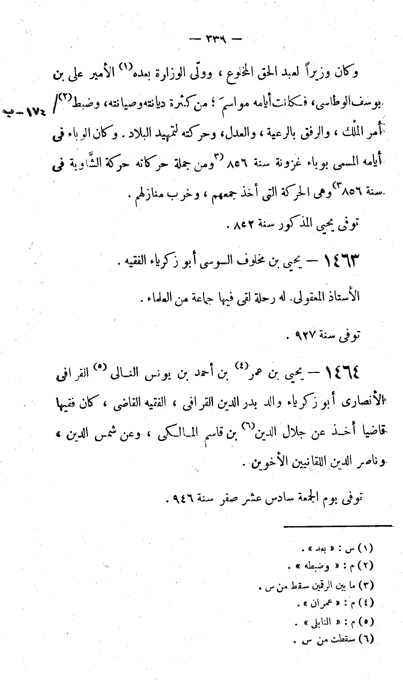 وكان وزيرا لعبد الحق المخوع، وولّى الوزارة بعده (1) الأمير على بن يوسف الوطاسى، فكانت أيامه مواسم؛ من كثرة ديانته وصيانته، وضبط (2) / أمر الملك، والرفق بالرعية، والعدل، وحركته لتمهيد البلاد. وكان الوباء فى أيامه المسمى بوباء غزونة سنة 856 (3) ومن جملة حركاته حركة الشّاوية فى سنة 856 (3) وهى الحركة التى أخذ جمعهم، وخرب منازلهم.
