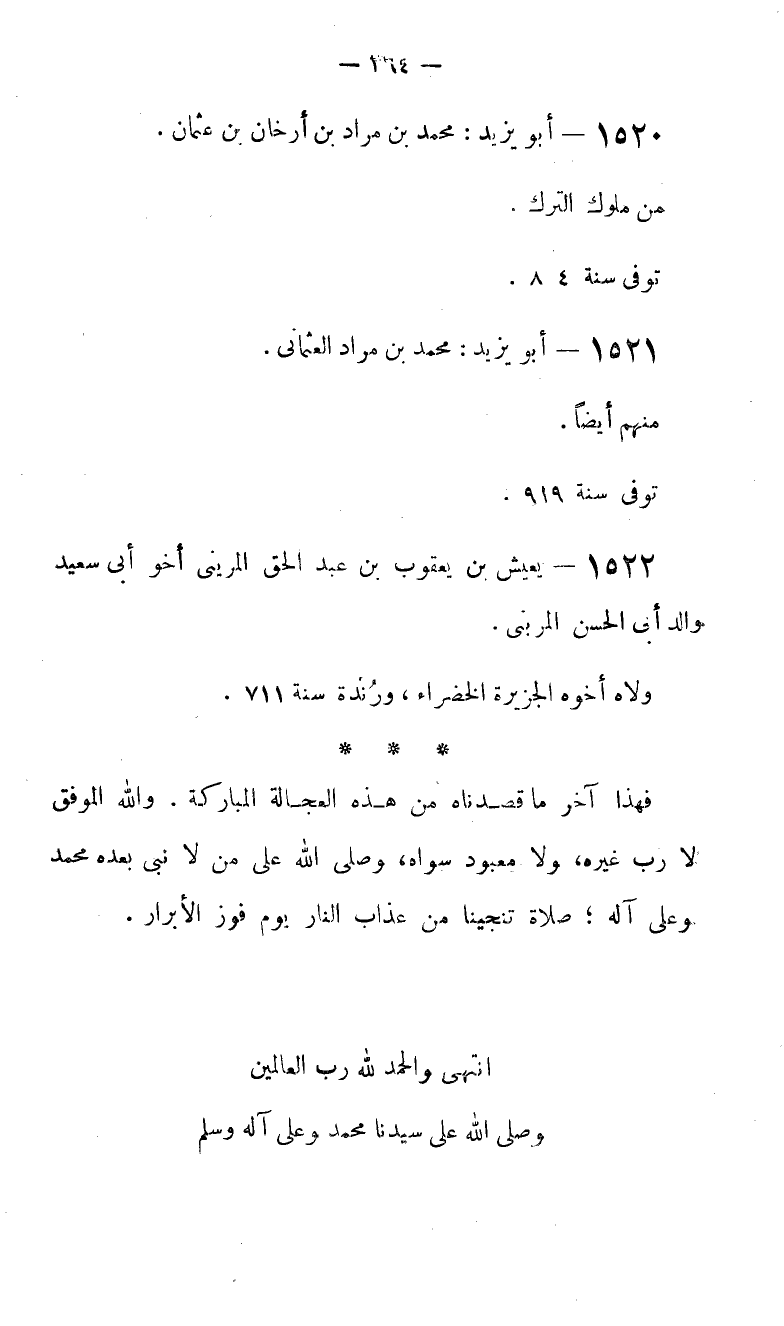 ... فهذا آخر ما قصدناه من هذه العجالة المباركة. والله الموفق لا رب غيره، ولا معبود سواه، وصلّى الله على من لا نبى بعده محمد وعلى آله؛ صلاة تنجينا من عذاب النار يوم فوز الأبرار.