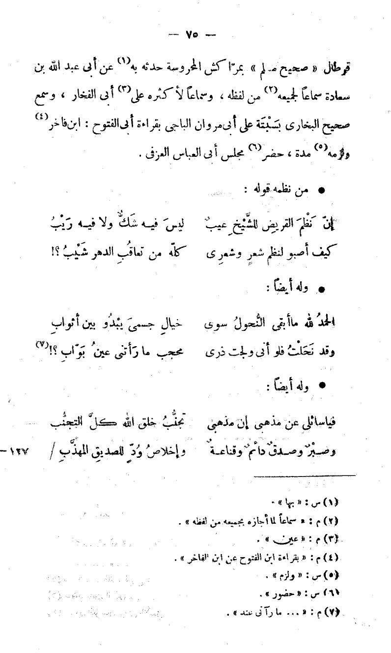 قرطال «صحيح مسلم» بمراكش المحروسة حدثه به (1) عن أبى عبد الله بن سعادة سماعا لجميعه (2) من لفظه، وسماعا لأكثره على (3) أبى الفخار، وسمع صحيح البخارى بسبتة على أبى مروان الباجى بقراءة أبى الفتوح: ابن فاخر (4) ولزمه (5) مدة، حضر (6) مجلس أبى العباس العزفى.