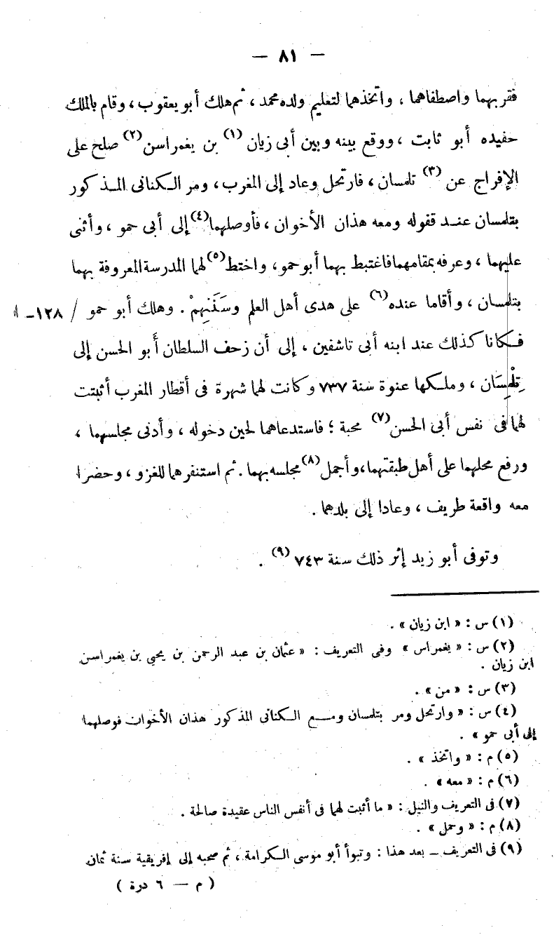 قلوبهما؟ ؟ ؟ واصطفاهما. واتخذهما لتعليم ولده محمد، ثم هلك أبو يعقوب، وقام بالملك حفيده أبو ثابت، ووقع بينه وبين أبى زيان (1) بن يغمراسن (2) صلح على الإفراج عن (3) تلمسان، فارتحل وعاد إلى المغرب، ومر الكنانى المذكور بتلمسان عند قفوله ومعه هذان الأخوان؛ فأوصلهما (4) إلى أبى حمو، وأثنى عليهما، وعرفه بمقامهما فاغتبط بهما أبو حمو. واحتط (5) لهما المدرسة المعروفة بهما بتلمسان، وأقاما عنده (6) على هدى أهل العلم وسننهم. وهلك أبو حمو/ فكانا كذلك عند ابنه أبى تاشفين، إلى أن زحف السلطان أبو الحسن إلى تلمسان، وملكها عنوة سنة 737 وكانت لهما شهرة في أقطار المغرب أثبتت لهما في نفس أبى الحسن (7) محبة؛ فاستدعاهما لحين دخوله، وأدنى مجلسهما، ورفع محلهما على أهل طبقتهما، وأجمل (8) مجلسه بهما. ثم استنفرهما للغزو، وحضرا معه واقعة طريف، وعادا إلى بلدهما.