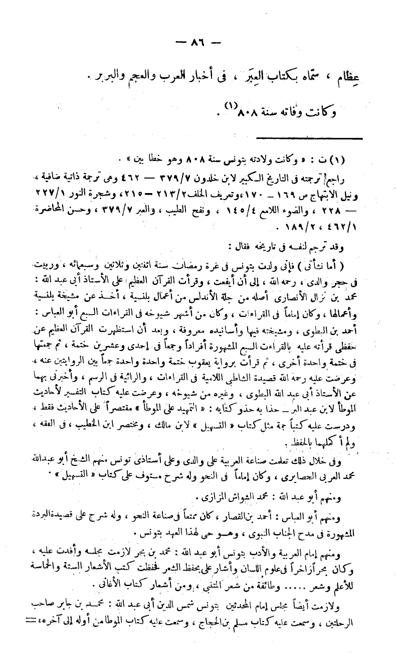 (1) ت: «وكانت ولادته بتونس سنة 808 وهو خطا بين». راجع ترجمته في التاريخ الكبير لابن خلدون 7/ 379 - 462 وهى ترجمة ذاتية ضافية، ونيل الابتهاج ص 169 - 170، وتعريف الخلف 2/ 213 - 215، وشجرة النور 1/ 227 - 228، والضوء اللامع 4/ 145، ونفح الطيب، والعبر 7/ 379، وحسن المحاضرة 1/ 462، 2/ 189. وقد ترجم لنفسه في تاريخه فقال: (أما نشأتى) فإنى ولدت بتونس في غرة رمضان سنة اثنتين وثلاثين وسبعمائة، وربيت فى حجر والدى، رحمه الله، إلى أن أيفعت، وقرأت القرآن العظيم على الأستاذ أبى عبد الله: محمد بن نزال الأنصارى أصله من جلة الأندلس من أعمال بلنسية، أخذ عن مشيخة بلنسبة وأعمالها، وكان إماما في القراءات، وكان من أشهر شيوخه في القراءات السبع أبو العباس: أحمد بن البطوى، ومشيخته فيها وأسانيده معروفة، وبعد أن استظهرت القرآن العظيم عن حفظى قرأته عليه بالقراءات السبع المشهورة أفرادا وجمعا في إحدى وعشرين ختمة، ثم جمعتها فى ختمة واحدة أخرى، ثم قرأت برواية يعقوب ختمة واحدة واحدة جمعا بين الروايتين عنه، وعرضت عليه رحمه الله قصيدة الشاطبى اللامية في القراءات، والرائية في الرسم، وأخبرنى بهما عن الأستاذ أبى عبد الله البطوى، وغيره من شيوخه، وعرضت عليه كتاب التفسير لأحاديث الموطأ لابن عبد البر-حذا به حذو كتابه: «التمهيد على الموطأ» مقتصرا على الأحاديث فقط. ودرست عليه كتبا جمة مثل كتاب «التسهيل» لابن مالك، ومختصر ابن الخطيب، فى الفقه، ولم أكملهما بالحفظ. وفي خلال ذلك تعلمت صناعة العربية على والدى وعلى أستاذى تونس منهم الشيخ أبو عبد الله محمد العربى الحصايرى، وكان إماما في النحو وله شرح مستوف على كتاب «التسهيل». ومنهم أبو عبد الله: محمد الشواش المزازى. ومنهم أبو العباس: أحمد بن القصار، كان ممتعا في صناعة النحو، وله شرح على قصيدة البردة المشهورة في مدح الجناب النبوى، وهو حى لهذا العهد بتونس. ومنهم إمام العربية والأدب بتونس أبو عبد الله: محمد بن بحر لازمت مجلسه وأفدت عليه. وكان بحرا زاخرا في علوم اللسان وأشار على بحفظ الشعر فحفظت كتب الأشعار الستة والحماسة للأعلم وشعر. . . . وطائفة من شعر المتنبى، ومن أشعار كتاب الأغانى؟ ؟ ؟ . ولازمت أيضا مجلس إمام المحدثين بتونس شمس الدين أبى عبد الله: محمد بن جابر صاحب الرحلتين، وسمعت عليه كتاب مسلم بن الحجاج، وسمعت عليه كتاب الموطا من أوله إلى آخره. -