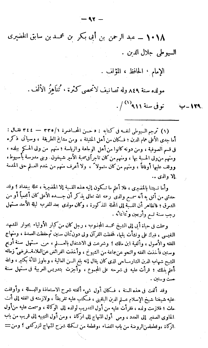 (1) ترجم السيوطى لنفسه في كتابه: «حسن المحاضرة 1/ 335 - 344 فقال: أما جدى الأعلى همام الدين؛ فكان من أهل الحقيقة، ومن مشايخ الطريقة، وسياتى ذكره فى قسم الصوفية، ومن دونه كانوا من أهل الوجاهة والرياسة؛ منهم من ولى الحكم ببلده، ومنهم من ولى الحسبة بها، ومنهم من كان تاجرا في صحبة الأمير شيخون وبنى مدرسة بأسيوط، ووقف عليها أوقافا، ومنهم من كان متمولا، ولا أعرف منهم من خدم العلم حق الخدمة إلا والدى. . وأما نسبتنا بالخضيرى، فلا أعلم ما تكون إليه هذه النسبة إلا الحضيرية، محلة ببغداد؛ وقد حدثنى من أثق به أنه سمع والدى رحمه الله تعالى يذكر أن جده الأعلى كان أعجميا أو من الشرق؛ فالظاهر أن النسبة إلى المحلة المذكورة، وكان مولدى بعد المغرب ليلة الأحد مستهل رجب سنة تسع وأربعين وثمانمائة. وحملت في حلة أبى إلى الشيخ محمد المجذوب، رجل كان من كبار الأولياء بجوار المشهد النفيسى، فبرك على ونشأت يتيما، فحفظت القرآن ولى دون ثمان سنين ثم حفظت العمدة، ومنهاج الفقه والأصول، وألفية ابن مالك؛ وشرعت في الاشتغال بالعلم، من مستهل سنة أربع وستين فأخذت الفقه والنحو عن جماعة من الشيوخ، وأخذت الفرائض عن العلامة-فرضي زمانه الشيخ شهاب الدين الشارمساحى الذى كان يقال إنه بلغ السن العالية، وجاوز المائة بكثير، والله أعلم بذلك؛ قرأت عليه في شرحه على المجموع، وأجزت بتدريس العربية في مستهل سنة ست وستين. وقد ألفت في هذه السنة، فكان أول شئ ألفته شرح الاستعاذة والبسملة، وأوقفت عليه شيخنا شيخ الإسلام علم الدين البلقينى، فكتب عليه تقربطا، ولازمته في الفقه إلى أن مات؛ فلازمت ولده، فقرأت عليه من أول التدريب لوالده إلى الوكالة، وسمعت عليه من أول الحاوى الصغير إلى العدد، ومن أول المنهاج إلى الزكاة، ومن أول التنبيه إلى قريب من باب الزكاة، وقطعة من الروضة من باب القضاء. وقطعة من تكملة شرح المنهاج لزركشى؛ ومن-
